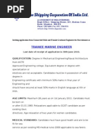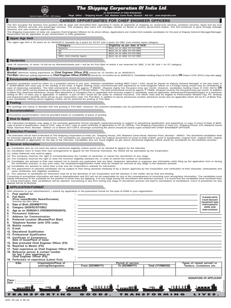 The interested candidates may apply in the enclosed application format alongwith copies/documents in support of educational qualification and experience i.e copy of proof of Date of Birth, copy of proof of qualification, copy of COC, copy of CDC, copy of caste certificate (if applicable) to VP I/C (SP&A), The Shipping Corporation of India Ltd., Shipping House, 245, Madame Cama Road, Nariman Point, Mumbai - 400021 on or before 22/11/2013. Envelope containing the above should be clearly super scribed with CHIEF ENGINEER OFFICER.