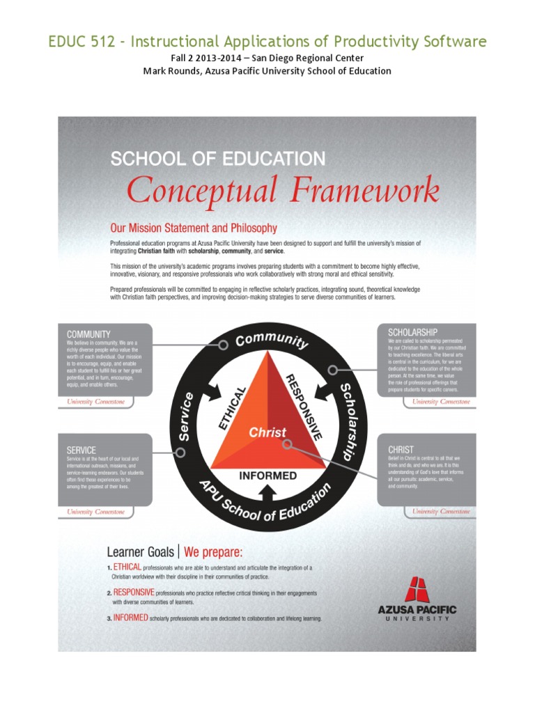 The assignments and projects are designed to be embedded in real, purposeful activities that can be applied to professional work or goals. By sharing projects and ideas together, we benefit from the unique perspectives and strengths of each other. Sharing our work in a professional environment benefits our professional practice as well as personal insight and knowledge base. All assignments and projects will be discussed in class and are described in detail on my website at: www.markrounds.com/apu-edtech/.