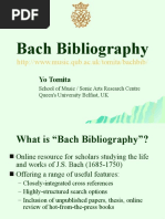 To find information on a composition by Bach To identify a work from its genre, title, first words, incipit or BWV number, consult the BWV or Bach Compendium. There you will find information on the work's date and purpose, scoring, text, sources, transmission, and on facsimiles and notable editions. For more detailed information on a work's sources, transmission, and musical text, consult the Critical commentary to the appropriate volume of the Neue BachAusgabe. For literature on the work, see its entries in the BWV and Bach Compendium. For literature on Bach's works in the genre, consult the index of this book, the bibliographies published in the Bach-Jahrbuch, and the bibliographies at the beginning of each work group in the Bach Compendium. Abbreviations for important Bach research tools BC BG BJ BR BWV Hans-Joachim Schulze and Christoph Wolff, Bach Compendium [Comprehensive catalogue of Bach's works and their sources] Bach-Gesellschaft, Johann Sebastian Bachs Werke [Complete edition of Bach's music, 1850-1900] Bach-Jahrbuch [Periodical devoted to Bach studies] Hans T. David and Arthur Mendel, The Bach reader [Translations of many documents of Bach's life] Wolfgang Schmieder, Thematisch-systematisches Verzeichnis der musikalischen Werke von Johann Sebastian Bach: Bach-Werke-Verzeichnis [Thematic catalogue of Bach's music] Bach-Archiv Leipzig, Bach-Dokumente, vols. 1-3 [Collected documents of Bach's life] Kritischer Bericht [Critical commentary volumes accompanying NBA] Johann Sebastian Bach, Neue Ausgabe samtlicher Werke [Neue BachAusgabe: Complete edition of Bach's music, 1950- ] The New Grove dictionary of music and musicians, ed. Stanley Sadie Staatsbibliothek zu BerlinStiftung PreuBischer Kulturbesitz [German national library]