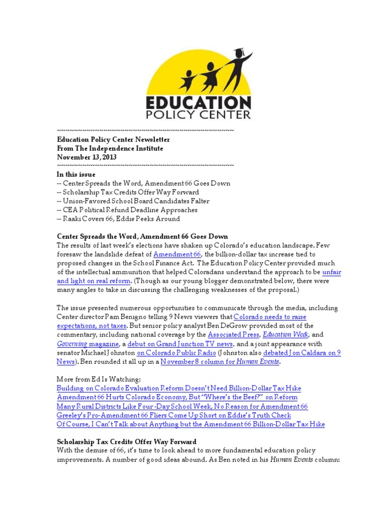 -- Center Spreads the Word, Amendment 66 Goes Down -- Scholarship Tax Credits Offer Way Forward -- Union-Favored School Board Candidates Falter -- CEA Political Refund Deadline Approaches -- Raaki Covers 66, Eddie Peeks Around Center Spreads the Word, Amendment 66 Goes Down The results of last weeks elections have shaken up Colorados education landscape. Few foresaw the landslide defeat of Amendment 66, the billion-dollar tax increase tied to proposed changes in the School Finance Act. The Education Policy Center provided much of the intellectual ammunition that helped Coloradans understand the approach to be unfair and light on real reform. (Though as our young blogger demonstrated below, there were many angles to take in discussing the challenging weaknesses of the proposal.) The issue presented numerous opportunities to communicate through the media, including Center director Pam Benigno telling 9 News viewers that Colorado needs to raise expectations, not taxes. But senior policy analyst Ben DeGrow provided most of the commentary, including national coverage by the Associated Press, Education Week, and Governing magazine, a debut on Grand Junction TV news, and a joint appearance with senator Michael Johnston on Colorado Public Radio (Johnston also debated Jon Caldara on 9 News). Ben rounded it all up in a November 8 column for Human Events. More from Ed Is Watching: Building on Colorado Evaluation Reform Doesnt Need Billion-Dollar Tax Hike Amendment 66 Hurts Colorado Economy, But Wheres the Beef? on Reform Many Rural Districts Like Four -Day School Week, No Reason for Amendment 66 Greeleys Pro-Amendment 66 Fliers Come Up Short on Eddies Truth Check Of Course, I Cant Talk about Anything but the Amendment 66 Billion-Dollar Tax Hike Scholarship Tax Credits Offer Way Forward With the demise of 66, its time to look ahead to more fundamental education policy improvements. A number of good ideas abound. As Ben noted in his Human Events column: