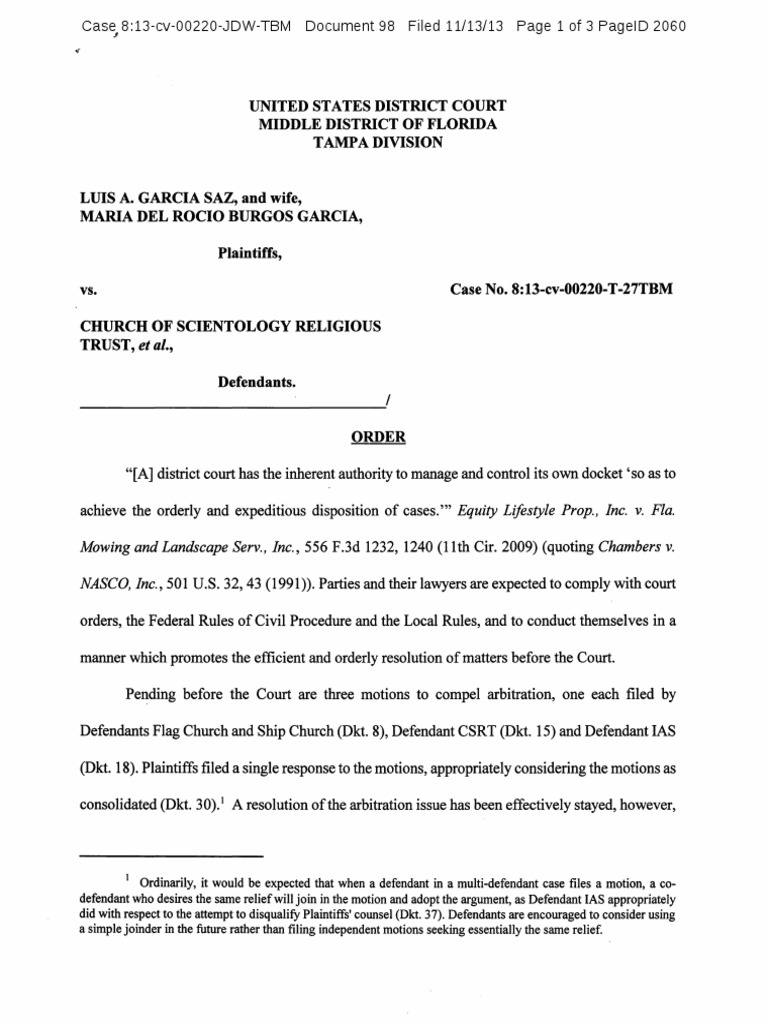 matters before the Court. Pending before the Court are three motions to compel arbitration, one each filed by Defendants Flag Church and Ship Church (Dkt. 8), Defendant CSRT (Dkt. 15) and Defendant lAS (Dkt. 18). Plaintiffs filed a single response to the motions, appropriately considering the motions as consolidated (Dkt. 30).