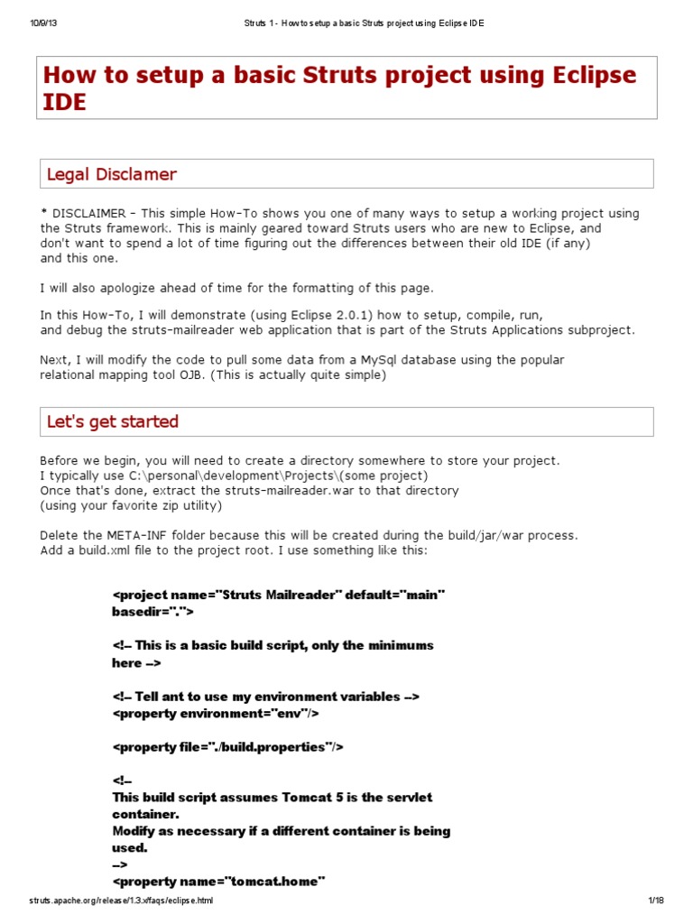 Before we begin, you will need to create a directory somewhere to store your project. I typically use C:\personal\development\Projects\(some project) Once that's done, extract the struts-mailreader.war to that directory (using your favorite zip utility) Delete the META-INF folder because this will be created during the build/jar/war process. Add a build.xml file to the project root. I use something like this: <project name="Struts Mailreader" default="main" basedir="."> <!-- This is a basic build script, only the minimums here --> <!-- Tell ant to use my environment variables --> <property environment="env"/> <property file="./build.properties"/> <!-This build script assumes Tomcat 5 is the servlet container. Modify as necessary if a different container is being used. --> <property name="tomcat.home"