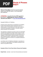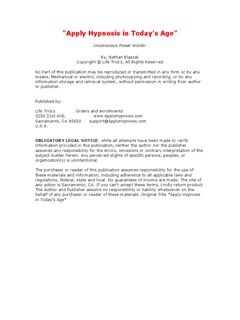 Unconscious Power Words! By, Nathan Blaszak Copyright Life Tricks, All Rights Reserved No Part of this publication may be reproduced or transmitted in any form or by any means, Mechanical or electric, including photocopying and recording, or by any information storage and retrieval system, without permission in writing from author or publisher. Published by: Life Tricks Orders and enrollments: 5250 21st AVE, www.ApplyHypnosis.com Sacramento, CA 95820 support@ApplyHypnosis.com U.S.A. OBLIGATORY LEGAL NOTICE: while all attempts have been made to verify information provided in this publication, neither the author nor the publisher assumes any responsibility for the errors, omissions or contrary interpretation of the subject matter herein. Any perceived slights of specific persons, peoples, or organization(s) is unintentional. The purchaser or reader of this publication assumes responsibility for the use of these materials and information, including adherence to all applicable laws and regulations, federal, state and local. No guarantees of income are made. The site of any action is Sacramento, CA. If you can't accept these terms, kindly return product. The Author and Publisher assume no responsibility or liability whatsoever on the behalf of any purchaser or reader of these materials. Original Title *Apply Hypnosis in Todays Age*