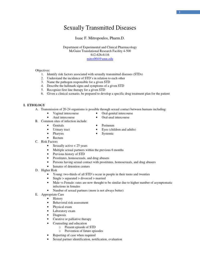 Objectives: 1. Identify risk factors associated with sexually transmitted diseases (STDs) 2. Understand the incidence of STDs in relation to each other 3. Name the pathogen responsible for a given STD 4. Describe the hallmark signs and symptoms of a given STD 5. Recognize first line therapy for a given STD 6. Given a clinical scenario, be prepared to develop a specific drug treatment plan for the patient