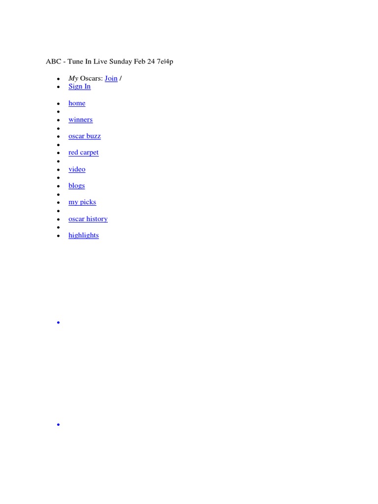 Home Video Photos History Oscar Buzz Official Oscars Ballot Login Register Alerts Oscars App About The Show oscars.org abc.com Contact Us Terms of Use Privacy Policy Facebook Twitter YouTube Google+ Get Glue