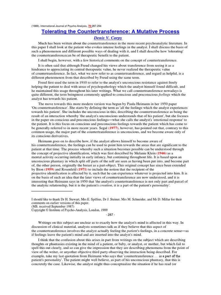 Carpy, D.V. (1989). Tolerating the Countertransference: A Mutative Process. Int. J. Psycho-Anal., 70:287-294