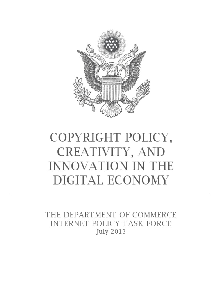 INTERNET POLICY TASK FORCE recognized, the Framers intended copyright itself to be the engine of free expression.1 In 2010, the Secretary of Commerce created the Internet Policy Task Force (Task Force) to provide policy coordination across the Department of Commerce, and to conduct initially a comprehensive review of privacy policy, copyright, global free flow of information, and cybersecurity, and their respective relationships to innovation in the Internet economy. To advance the dual public policy imperative of combat[ing] online copyright infringement more effectively and sustain[ing] innovative uses of information and information technology, the Task Force launched a dialogue to contribute to Administration-wide policy positions and to further a global consensus on fostering creativity and innovation online.2 In 2010, the Task Force held listening sessions with a wide range of stakeholders to understand the current major questions related to online copyright protection as well as the broader impact on innovation in the Internet economy. The Task Force then convened a public meeting on July 1, 2010, to further explore these issues.3 Subsequently, the Task Force published a Notice of Inquiry (NOI) and received several hundred submissions in response.4 The Task Force has closely followed the developments that have taken place since that time, including proposed legislation on online enforcement tools; negotiations of voluntary agreements between various types of intermediaries and content owners; and studies, inquiries and rulemakings by the U.S. Copyright Office of the Library of Congress. Additional input was obtained through reviewing the submissions made to the Office of the Intellectual Property Enforcement Coordinator (IPEC) in connection with the 2013 Joint Strategic Plan for Intellectual Property Enforcement.5 Through this process, the Task Force has sought to understand stakeholders experiences, the benefits and shortcomings of existing law, and the various initiatives that have been implemented or proposed to address online copyright issues. NOI respondents and symposium participants focused on numerous topics, including: (1) the levels and impact of online copyright infringement; (2) emerging services and business models, both legal and illegal; (3) intermediary roles, responsibilities, and protections; and (4) issues involved in online protection efforts, including experiences with notice and takedown under the Digital Millennium Copyright Act (DMCA), and the problem of repeat infringers.