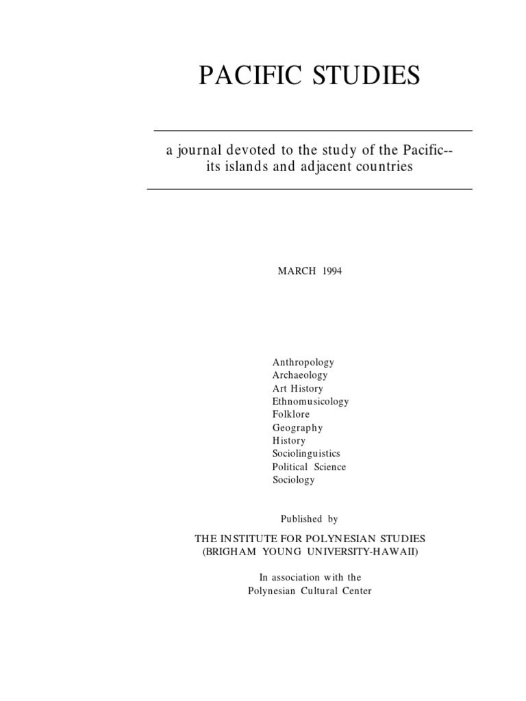 Editorial Policy: Pacific Studies is published quarterly by The Institute for Polynesian Studies, Brigham Young University-Hawaii, Laie, Hawaii 96762-1294, but responsibility for opinions expressed in the articles rests with the authors alone. Subscription rate is U.S. $30.00, payable to The Institute for Polynesian Studies. Articles submitted to the editor must not be submitted elsewhere while under review by Pacific Studies and should be the original typewritten copy, completely double-spaced (including quotations, references, and notes). Authors may write to the editor for a style sheet and information on computer-disk submissions, Books for review should also be sent to the editor. The Institute for Polynesian Studies is an organization funded by Brigham Young University-Hawaii. The Institute assists the University in meeting its cultural and educational goals by undertaking a program of teaching, research, and publication. The Institute cooperates with other scholarly and research institutions in achieving their objectives. It publishes monographs, produces films, underwrites research, and sponsors conferences on the Pacific islands. Further information on the activities of the Institute may be obtained by writing to the editor.