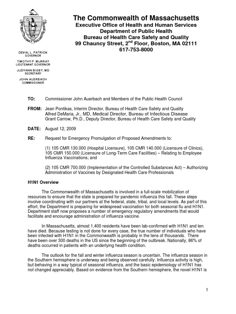 Request for Emergency Promulgation of Proposed Amendments to:(1) 105 CMR 130.000 (Hospital Licensure), 105 CMR 140.000 (Licensure of Clinics),105 CMR 150.000 (Licensure of Long-Term Care Facilities) – Relating to EmployeeInfluenza Vaccinations; and(2) 105 CMR 700.000 (Implementation of the Controlled Substances Act) – AuthorizingAdministration of Vaccines by Designated Health Care Professionals