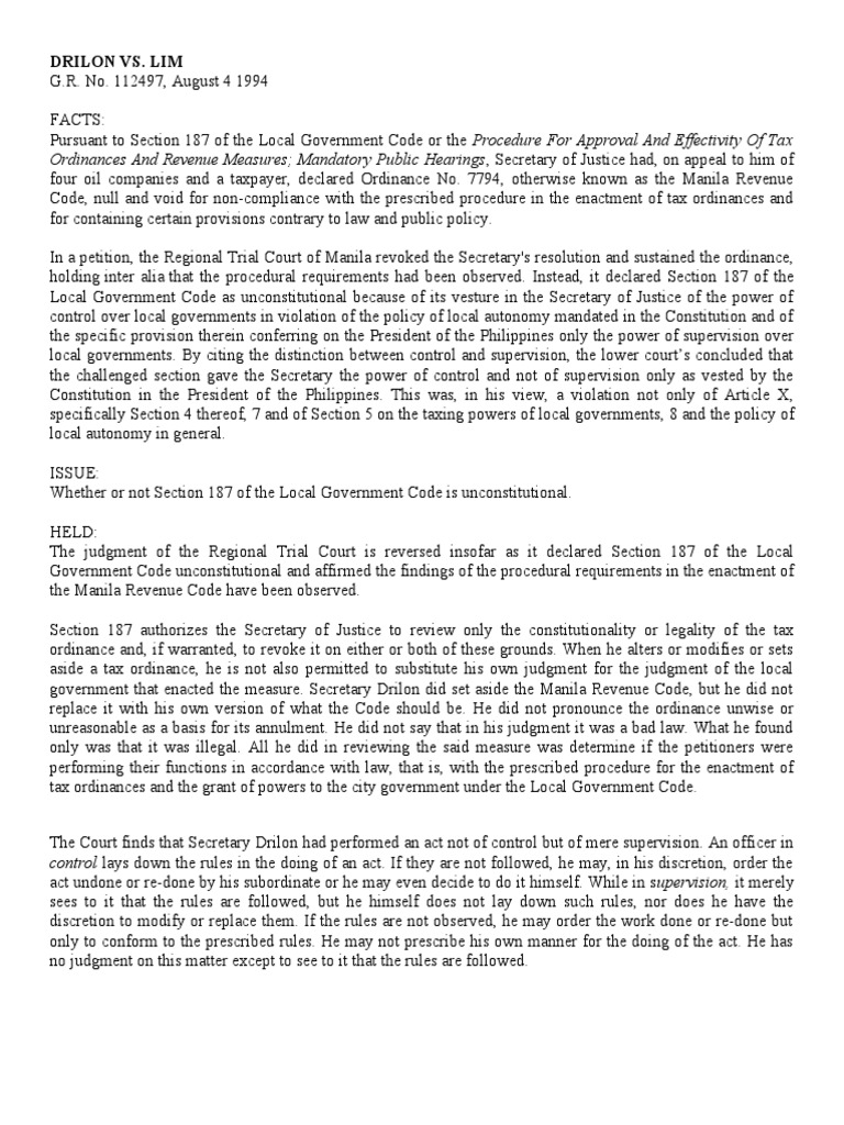 oca" Go#ern$ent Co%e or t e Procedure For Approval And Effectivity Of Tax Ordinances And Revenue Measures; Mandatory Public Hearings , Secretar& of 'ustice a%, on a((ea" to i$ of four oi" co$(anies an% a ta)(a&er, %ec"are% *r%inance No. 7794, ot er+ise ,no+n as t e -ani"a Re#enue Co%e, nu"" an% #oi% for non.co$("iance +it t e (rescri/e% (roce%ure in t e enact$ent of ta) or%inances an% for containing certain (ro#isions contrar& to "a+ an% (u/"ic (o"ic&. 0n a (etition, t e Regiona" Tria" Court of -ani"a re#o,e% t e Secretar&1s reso"ution an% sustaine% t e or%inance, o"%ing inter a"ia t at t e (roce%ura" re2uire$ents a% /een o/ser#e%. 0nstea%, it %ec"are% Section 187 of t e !oca" Go#ern$ent Co%e as unconstitutiona" /ecause of its #esture in t e Secretar& of 'ustice of t e (o+er of contro" o#er "oca" go#ern$ents in #io"ation of t e (o"ic& of "oca" autono$& $an%ate% in t e Constitution an% of t e s(ecific (ro#ision t erein conferring on t e Presi%ent of t e P i"i((ines on"& t e (o+er of su(er#ision o#er "oca" go#ern$ents. 3& citing t e %istinction /et+een contro" an% su(er#ision, t e "o+er court4s conc"u%e% t at t e c a""enge% section ga#e t e Secretar& t e (o+er of contro" an% not of su(er#ision on"& as #este% /& t e Constitution in t e Presi%ent of t e P i"i((ines. T is +as, in is #ie+, a #io"ation not on"& of Artic"e 5, s(ecifica""& Section 4 t ereof, 7 an% of Section 6 on t e ta)ing (o+ers of "oca" go#ern$ents, 8 an% t e (o"ic& of "oca" autono$& in genera". 0SS78: 9 et er or not Section 187 of t e !oca" Go#ern$ent Co%e is unconstitutiona". :8!;: T e <u%g$ent of t e Regiona" Tria" Court is re#erse% insofar as it %ec"are% Section 187 of t e !oca" Go#ern$ent Co%e unconstitutiona" an% affir$e% t e fin%ings of t e (roce%ura" re2uire$ents in t e enact$ent of t e -ani"a Re#enue Co%e a#e /een o/ser#e%. Section 187 aut ori=es t e Secretar& of 'ustice to re#ie+ on"& t e constitutiona"it& or "ega"it& of t e ta) or%inance an%, if +arrante%, to re#o,e it on eit er or /ot of t ese groun%s. 9 en e a"ters or $o%ifies or sets asi%e a ta) or%inance, e is not a"so (er$itte% to su/stitute is o+n <u%g$ent for t e <u%g$ent of t e "oca" go#ern$ent t at enacte% t e $easure. Secretar& ;ri"on %i% set asi%e t e -ani"a Re#enue Co%e, /ut e %i% not re("ace it +it is o+n #ersion of + at t e Co%e s ou"% /e. :e %i% not (ronounce t e or%inance un+ise or unreasona/"e as a /asis for its annu"$ent. :e %i% not sa& t at in is <u%g$ent it +as a /a% "a+. 9 at e foun% on"& +as t at it +as i""ega". A"" e %i% in re#ie+ing t e sai% $easure +as %eter$ine if t e (etitioners +ere (erfor$ing t eir functions in accor%ance +it "a+, t at is, +it t e (rescri/e% (roce%ure for t e enact$ent of ta) or%inances an% t e grant of (o+ers to t e cit& go#ern$ent un%er t e !oca" Go#ern$ent Co%e. T e Court fin%s t at Secretar& ;ri"on a% (erfor$e% an act not of contro" /ut of $ere su(er#ision. An officer in control "a&s %o+n t e ru"es in t e %oing of an act. 0f t e& are not fo""o+e%, e $a&, in is %iscretion, or%er t e act un%one or re.%one /& is su/or%inate or e $a& e#en %eci%e to %o it i$se"f. 9 i"e in s upervision, it $ere"& sees to it t at t e ru"es are fo""o+e%, /ut e i$se"f %oes not "a& %o+n suc ru"es, nor %oes e a#e t e %iscretion to $o%if& or re("ace t e$. 0f t e ru"es are not o/ser#e%, e $a& or%er t e +or, %one or re.%one /ut on"& to confor$ to t e (rescri/e% ru"es. :e $a& not (rescri/e is o+n $anner for t e %oing of t e act. :e as no <u%g$ent on t is $atter e)ce(t to see to it t at t e ru"es are fo""o+e%.