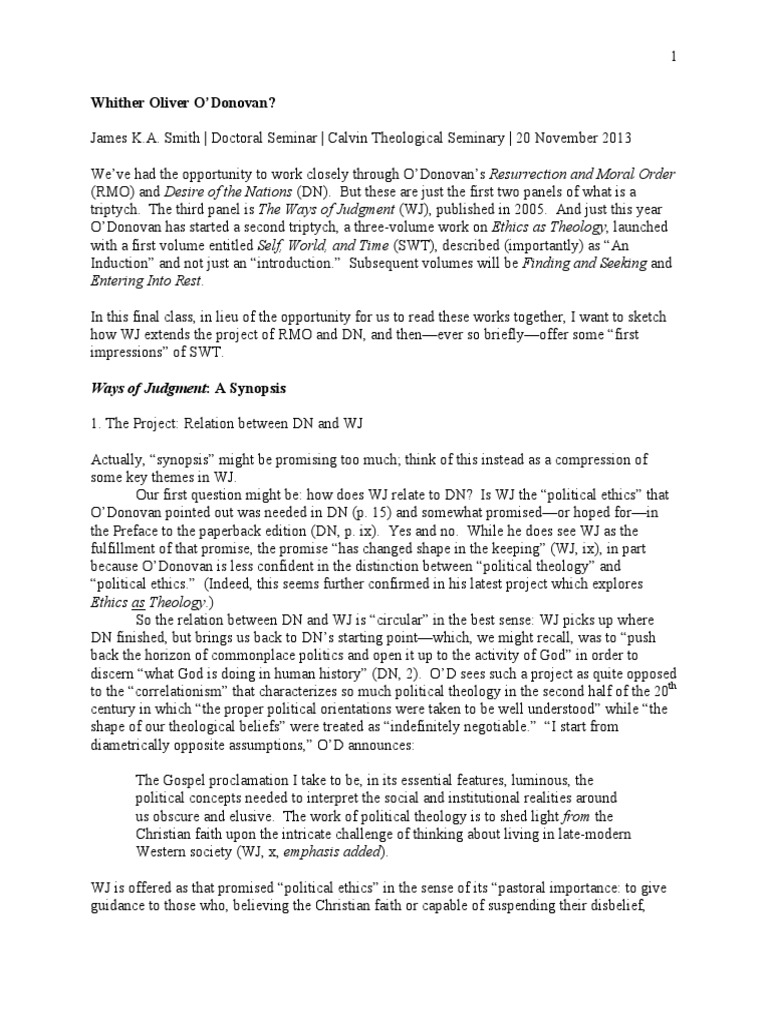 Smith | Doctoral Seminar | Calvin Theological Seminary | 20 November 2013 Weve had the opportunity to work closely through ODonovans Resurrection and Moral Order (RMO) and Desire of the Nations (DN). But these are just the first two panels of what is a triptych. The third panel is The Ways of Judgment (WJ), published in 2005. And just this year ODonovan has started a second triptych, a three-volume work on Ethics as Theology, launched with a first volume entitled Self, World, and Time (SWT), described (importantly) as An Induction and not just an introduction. Subsequent volumes will be Finding and Seeking and Entering Into Rest. In this final class, in lieu of the opportunity for us to read these works together, I want to sketch how WJ extends the project of RMO and DN, and thenever so brieflyoffer some first impressions of SWT. Ways of Judgment: A Synopsis 1. The Project: Relation between DN and WJ Actually, synopsis might be promising too much; think of this instead as a compression of some key themes in WJ. Our first question might be: how does WJ relate to DN? Is WJ the political ethics that ODonovan pointed out was needed in DN (p. 15) and somewhat promisedor hoped forin the Preface to the paperback edition (DN, p. ix). Yes and no. While he does see WJ as the fulfillment of that promise, the promise has changed shape in the keeping (WJ, ix), in part because ODonovan is less confident in the distinction between political theology and political ethics. (Indeed, this seems further confirmed in his latest project which explores Ethics as Theology.) So the relation between DN and WJ is circular in the best sense: WJ picks up where DN finished, but brings us back to DNs starting pointwhich, we might recall, was to push back the horizon of commonplace politics and open it up to the activity of God in order to discern what God is doing in human history (DN, 2). OD sees such a project as quite opposed to the correlationism that characterizes so much political theology in the second half of the 20th century in which the proper political orientations were taken to be well understood while the shape of our theological beliefs were treated as indefinitely negotiable. I start from diametrically opposite assumptions, OD announces: The Gospel proclamation I take to be, in its essential features, luminous, the political concepts needed to interpret the social and institutional realities around us obscure and elusive. The work of political theology is to shed light from the Christian faith upon the intricate challenge of thinking about living in late-modern Western society (WJ, x, emphasis added). WJ is offered as that promised political ethics in the sense of its pastoral importance: to give guidance to those who, believing the Christian faith or capable of suspending their disbelief,