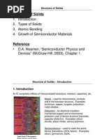 Crystal Lattices "emiconductor properties can be strongly affected by crystal structure. Types of Solids #asically, there are three types of solids! crystalline, amorphous, and polycrystalline. Crystalline Solids $toms ma1ing up the solid arranged in a periodic fashion, repeated throughout. -ave long&range order. 2sed for IC fabrication. Amorphous Solids -ave no periodic structure at all. Interatomic distance and bond angles are almost the same as in the crystalline material of the same substance, however, a long&range order is missing. "aid to have short&range order. a&"i (alloy of amorphous "i with and other similar amorphous alloys) has found important applications in photovoltaic technology and in large&area ICs used in flat displays, printers, copiers, scanners, and imagers.