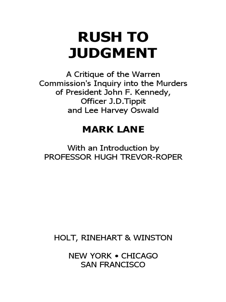 I gratefully acknowledge the advice, encouragement and assistance of many men and women. Bertrand Russell, Professor Arnold Toynbee and Professor Hugh Trevor-Roper were kind enough to read the manuscript and make suggestions. Among the many amateur investigators who journeyed to Dallas to gather information were Mrs Shirley Martin and her family, Professor Henry Grattan, Marvin Garson, Mr and Mrs Vincent Salandria, Harold Feldman, Mr and Mrs George Nash, Barbara Bridges, Roy Douglas, Margo Hamilton, Emile de Antonio, Ruth Fortel and Anne-Lise Lane. Stewart Galanor and Marlene Behrends served as researchers; their contribution was exceptional. Much of the early investigation and research was stimulated by the Citizens' Committee of Inquiry in the United States and sister committees in Great Britain and Denmark. I am thankful to all those who participated in and supported the workin particular, Deirdre Griswold in New York and Ralph Schoenman in London. I am deeply indebted to Benjamin Sonnenberg, Jr, whose numerous and invaluable suggestions have found their way into this volume. This was not an easy book to publish in the year 1966. I am grateful to my publisher and especially to Arthur A. Cohen. M.L. [25]