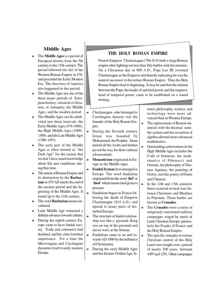 The Middle Ages is a period of European history from the 5th century to the 15th century. The period followed the fall of the Western Roman Empire in 476, and preceded the Early Modern Era. The discovery of America also happened in this period. The Middle Ages are one of the three major periods of European history: classical civilization, or Antiquity; the Middle Ages; and the modern period. The Middle Ages can be subdivided into three intervals, the Early Middle Ages (476-1000), the High Middle Ages (1000 1300), and the Late Middle Ages (13001453). The early part of the Middle Ages is often termed as the Dark Age for the reason that we dont have much knowledge about life and conditions during that time. The attack of Roman Empire and its destruction by the Barbarians in 455 AD marks the end of the ancient period and the beginning of the Middle Ages. It lasted up to the 11th century. The word Barbarian means uncultured. Later Middle Age witnessed a definite advance towards culture. During the eighth century Europe came to have feudal society. Trade and commerce had declined, and her cities lost their importance. For a time the Merovingian and Carolingian dynasties tried to unify western Europe.