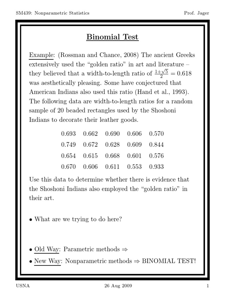 New Way: Binomial Test Test uses the median instead of the mean. For a continuous distribution, the median (.5 ) satises: P r(X > .5 ) = P r(X < .5 ) = .5 For the golden rule example, our hypotheses are then: