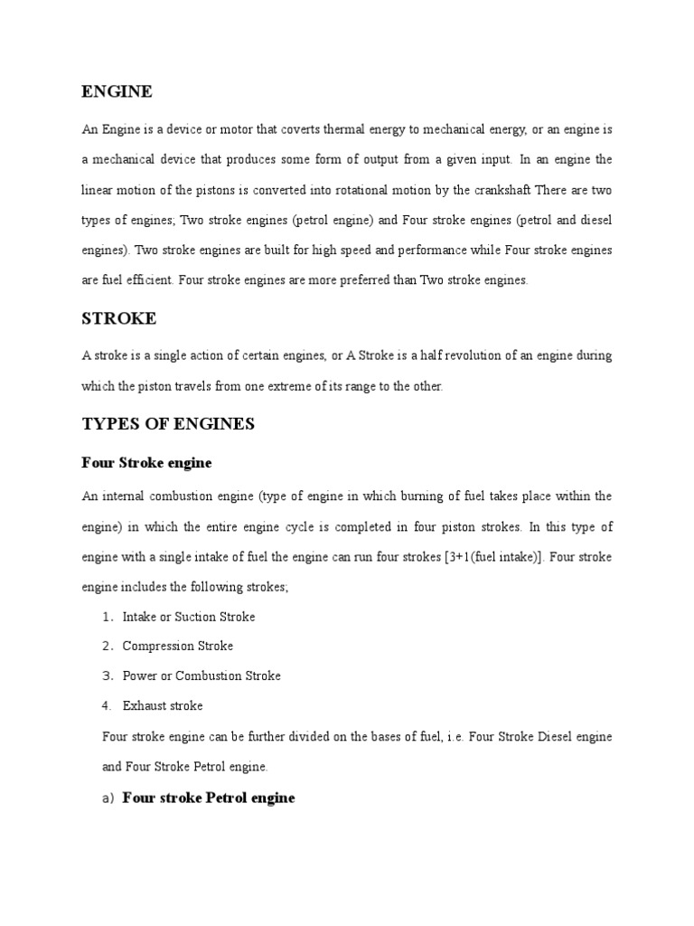 types of engines; Two stroke engines (petrol engine) and Four stroke engines (petrol and diesel