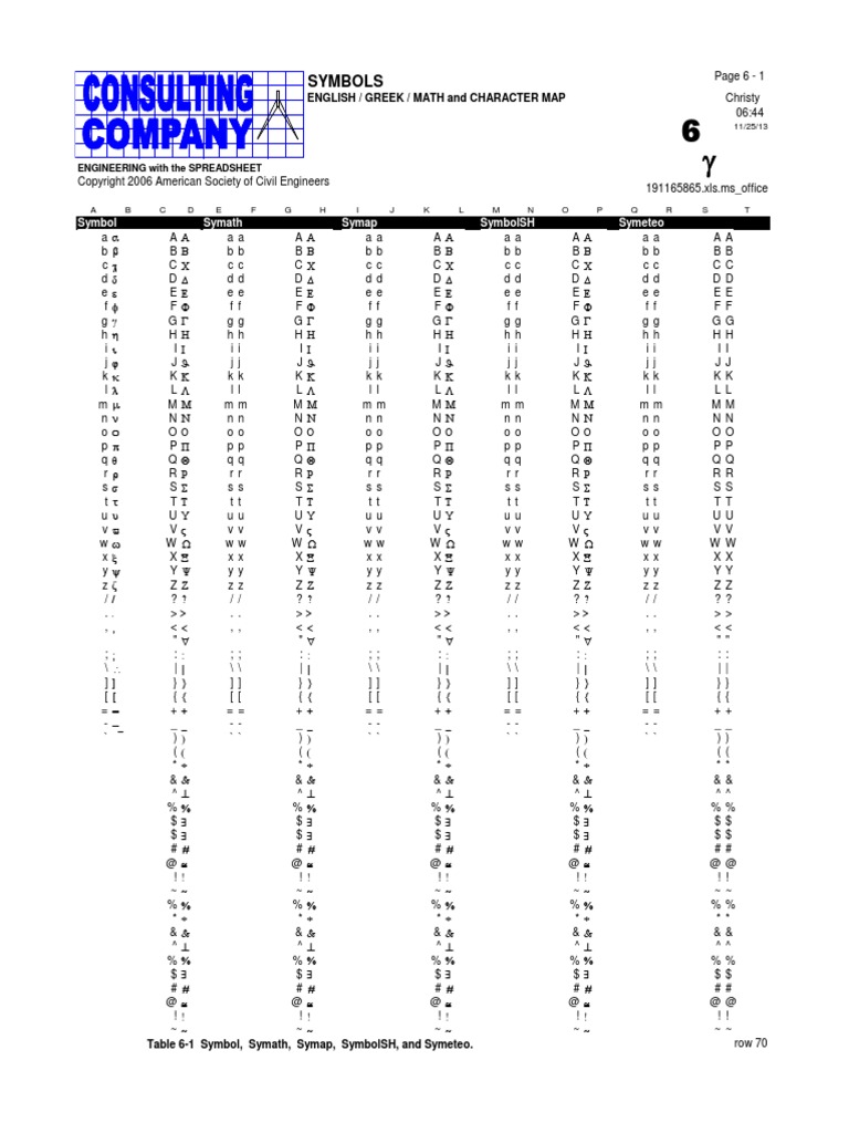 Table 6- 11 Characters that serve as range names FORMATTING CHARACTERS USED AS RANGE NAMES These characters come from the Arial character map and are formatted as follows: Arial GreekC Courier New Greek row 290