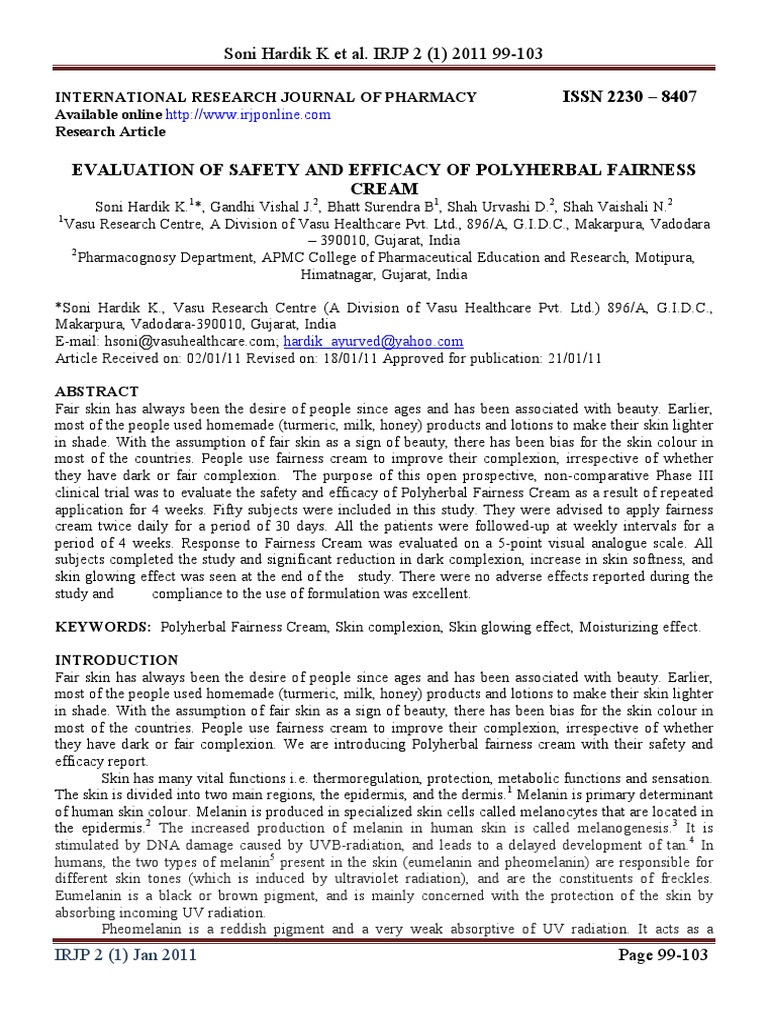 clinical trial was to evaluate the safety and efficacy of Polyherbal Fairness Cream as a result of repeated
