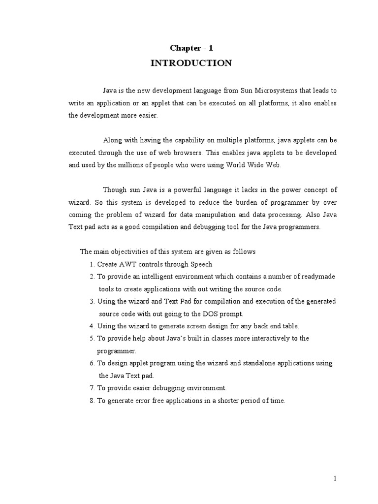 Though sun Java is a powerful language it lac!s in the power concept of wi"ard. So this system is developed to reduce the burden of programmer by over coming the problem of wi"ard for data manipulation and data processing. Also Java Text pad acts as a good compilation and debugging tool for the Java programmers. The main objectivities of this system are given as follows #. $reate A T controls through Speech %. To provide an intelligent environment which contains a number of readymade tools to create applications with out writing the source code. &. 'sing the wi"ard and Text (ad for compilation and execution of the generated source code with out going to the )*S prompt. +. 'sing the wi"ard to generate screen design for any bac! end table. ,. To provide help about Java-s built in classes more interactively to the programmer. .. To design applet program using the wi"ard and standalone applications using the Java Text pad. /. To provide easier debugging environment. 0. To generate error free applications in a shorter period of time.