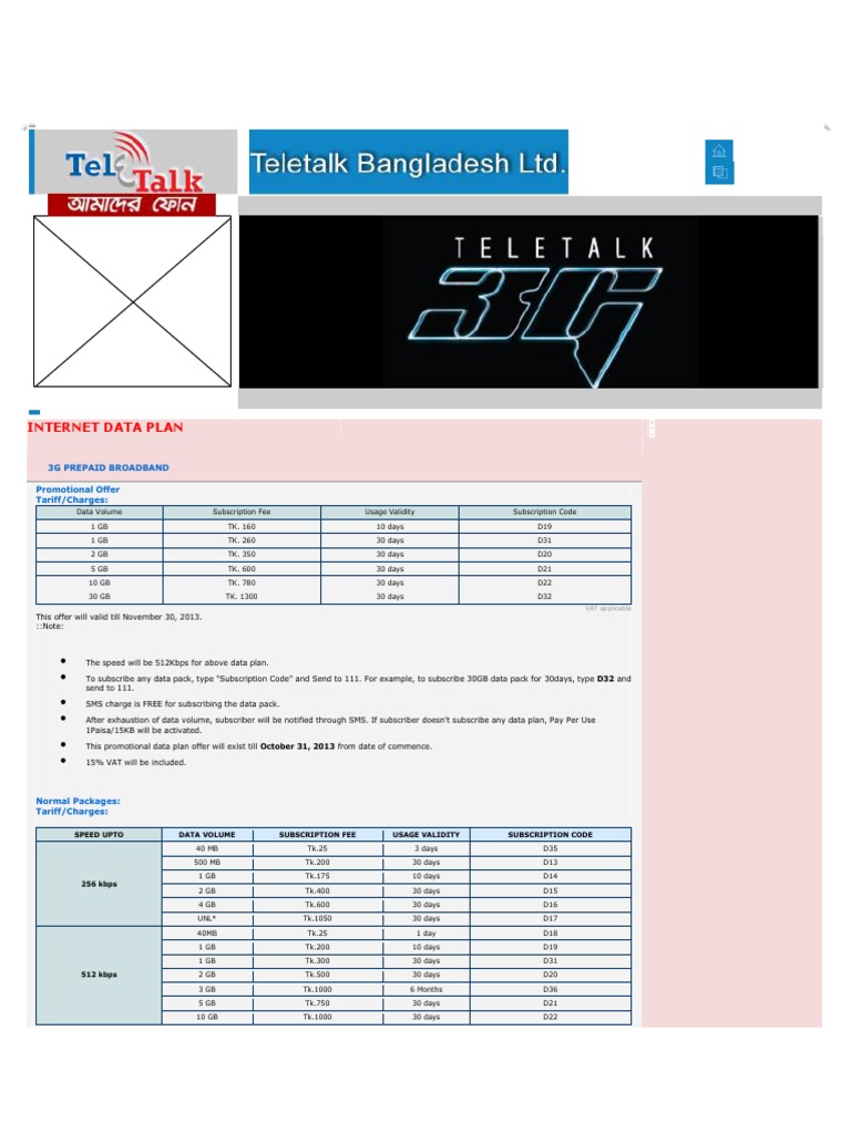 Data Volume 1 GB 1 GB 2 GB 5 GB 10 GB 30 GB Subscription Fee TK. 160 TK. 260 TK. 350 TK. 600 TK. 780 TK. 1300 Usage Validity 10 days 30 days 30 days 30 days 30 days 30 days Subscription Code D19 D31 D20 D21 D22 D32
