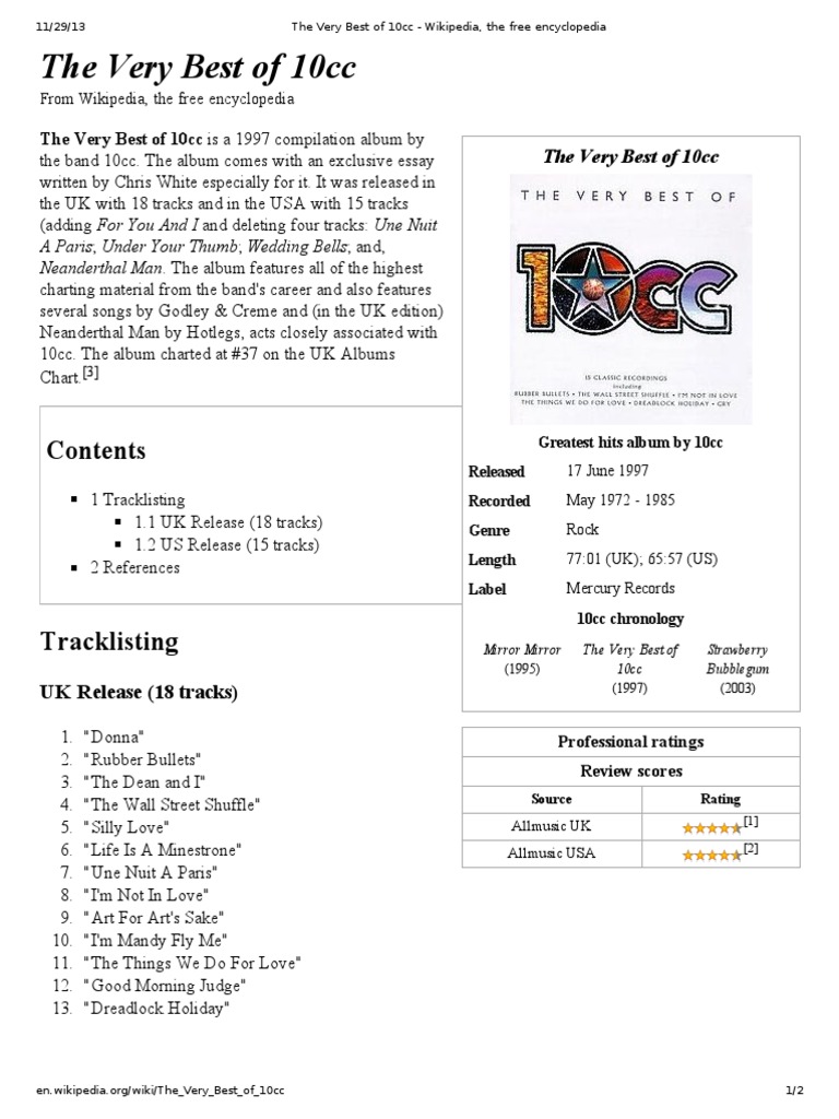 Retrievedfrom"[Link] Categories: 10ccalbums 2006greatesthitsalbums Englishlanguagecompilationalbums MercuryRecordscompilationalbums Thispagewaslastmodifiedon7October2013at22:45. TextisavailableundertheCreativeCommonsAttributionShareAlikeLicenseadditionaltermsmay [Link],youagreetotheTermsofUseandPrivacyPolicy. WikipediaisaregisteredtrademarkoftheWikimediaFoundation,Inc.,anonprofitorganization.