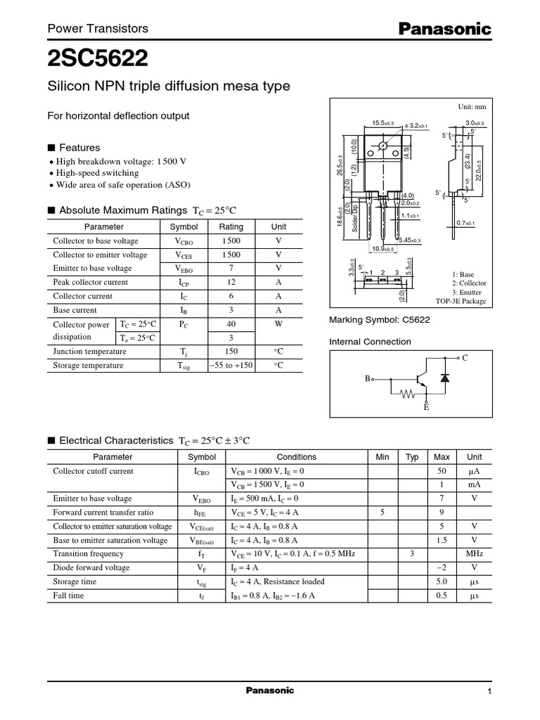High breakdown voltage: 1 500 V High-speed switching Wide area of safe operation (ASO)