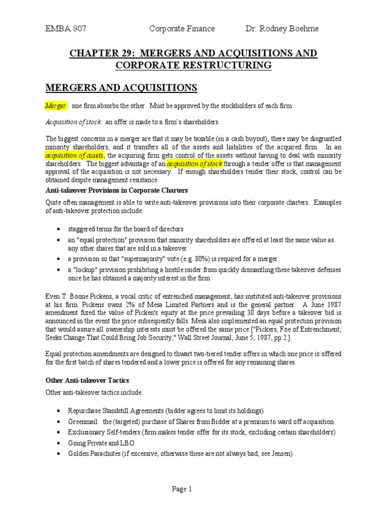 CHAPTER 29: MERGERS AND ACQUISITIONS AND CORPORATE RESTRUCTURING MERGERS AND ACQUISITIONS