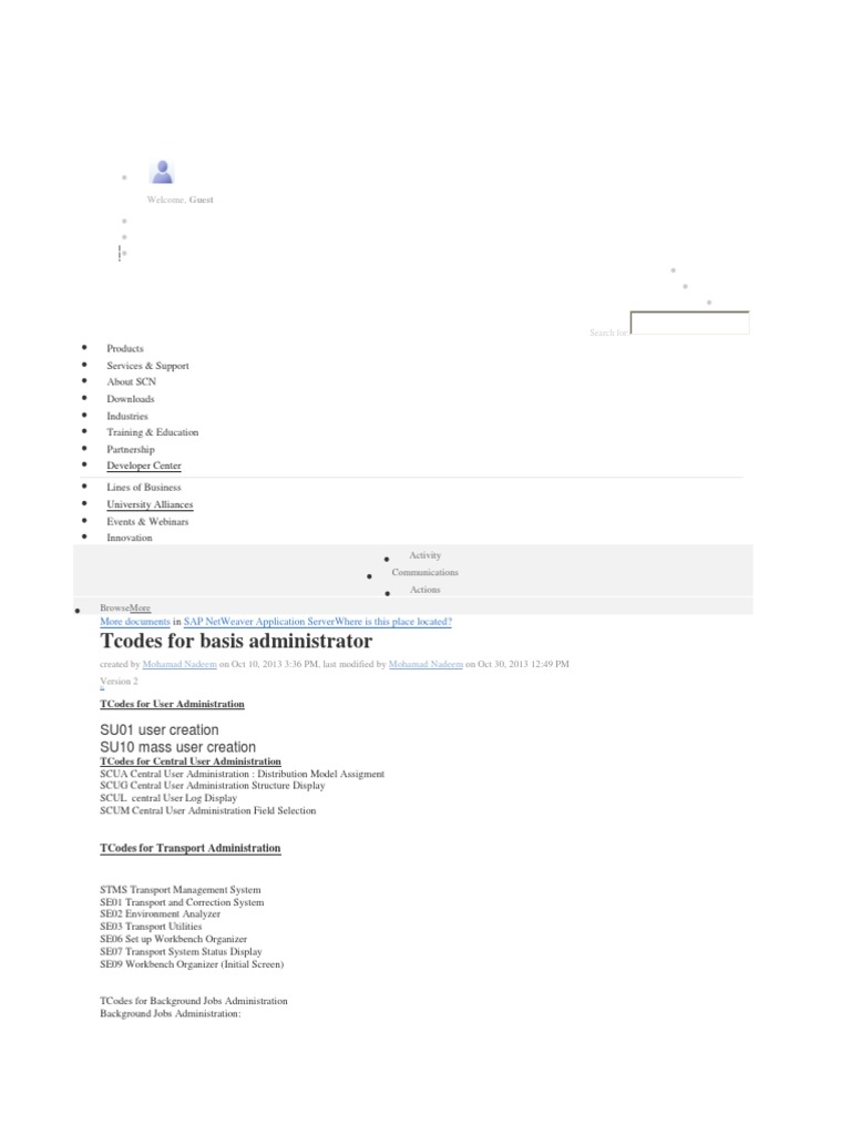 Tcodes for System Maintenance SM01 Lock Transactions SM02 System Messages SM04 User Overview SM12 Display and Delete Locks SM13 Display Update Records SM14 Update Program Administration SM21 System log SM23 System Log Analysis SM28 Installation Check SM29 Model Transfer for Tables SM30 Call Up View Maintenance SM34 Viewcluster maintenancecall SM35 Batch Input Monitoring SM36 Batch request SM37 Background job overview SM38 Queue Maintenance Transaction SM39 Job analysis SM49 Execute Logical Commands SM50 Work Process Overview SM51 List of SAP Servers SM54 TXCOM maintenance SM55 THOST maintenance SM56 Number Range Buffer SM58 Asynchronous RFC Error Log SM59 RFC Destinations (Display/Maintain) SM60 Borrow/Return Objects