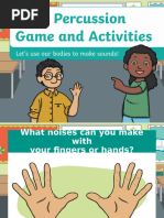 The teacher makes a sound clapping hands, clicking fingers, slapping knees, stamping feet and the children copy the sound. When all of the children are making the sound, the teacher makes another sound and the children copy this new sound. When the children have experienced a wide variety of sounds, one of the children can be chosen to be the leader. Possible sounds varying the volume Clapping Hands loudly Clapping hands quietly Tapping palm with two fingers Clapping cupped hands Clapping flat hands Rubbing hands together cupped Rubbing arms or legs Rubbing backs of hands together Slapping knees Clicking fingers Tapping finger nails Tapping finger tips together Tapping knuckles Tapping backs of hands together Flicking fingers in the air Flicking on the other palm Rubbing backs of hands Stroking arm or legs Popping air filled cheeks gently Popping inside of cheek Tapping feet Stamping feet Tapping toes on floor Clicking heels On table or floor Tapping fingertips on table or floor Tapping fingernails on table or floor Tapping knuckles on table or floor Tapping whole fingers on table or floor Tapping whole hands on table or floor Rubbing fingers on table or floor Rubbing hands on table or floor Slapping fingers on table or floor Slapping hands on table or floor Banging fists on table or floor Knocking knees together etc.....