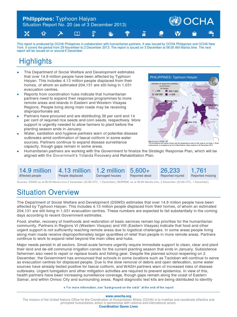 This report is produced by OCHA Philippines in collaboration with humanitarian partners. It was issued by OCHA Philippines and OCHA New York. It covers the period from 29 November to 2 December 2013. The report is issued on 3 December at 06:00 AM Manila time. The next report will be issued on or around 6 December.