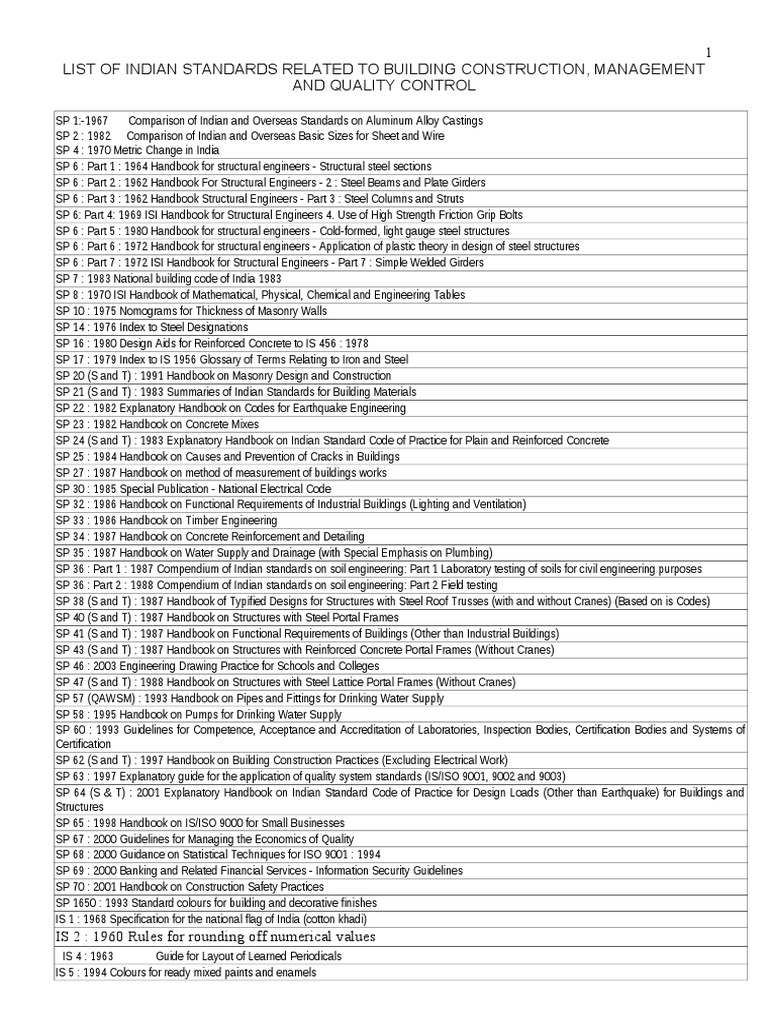 SP 1:-1967 Comparison of Indian and Overseas Standards on Aluminum Alloy Castings SP 2 : 19 2 Comparison of Indian and Overseas !asi" Si#es for S$eet and %ire SP & : 197' (etri" C$ange in India SP 6 : Part 1 : 196& )and*oo+ for stru"tural engineers - Stru"tural steel se"tions SP 6 : Part 2 : 1962 )and*oo+ ,or Stru"tural -ngineers - 2 : Steel !eams and Plate .irders SP 6 : Part / : 1962 )and*oo+ Stru"tural -ngineers - Part / : Steel Columns and Struts SP 6: Part &: 1969 ISI )and*oo+ for Stru"tural -ngineers &0 1se of )ig$ Strengt$ ,ri"tion .rip !olts SP 6 : Part 2 : 19 ' )and*oo+ for stru"tural engineers - Cold-formed3 lig$t gauge steel stru"tures SP 6 : Part 6 : 1972 )and*oo+ for stru"tural engineers - Appli"ation of plasti" t$eory in design of steel stru"tures SP 6 : Part 7 : 1972 ISI )and*oo+ for Stru"tural -ngineers - Part 7 : Simple %elded .irders SP 7 : 19 / 4ational *uilding "ode of India 19 / SP : 197' ISI )and*oo+ of (at$emati"al3 P$ysi"al3 C$emi"al and -ngineering 5a*les SP 1' : 1972 4omograms for 5$i"+ness of (asonry %alls SP 1& : 1976 Inde6 to Steel 7esignations SP 16 : 19 ' 7esign Aids for 8einfor"ed Con"rete to IS &26 : 197 SP 17 : 1979 Inde6 to IS 1926 .lossary of 5erms 8elating to Iron and Steel SP 2' 9S and 5: : 1991 )and*oo+ on (asonry 7esign and Constru"tion SP 21 9S and 5: : 19 / Summaries of Indian Standards for !uilding (aterials SP 22 : 19 2 -6planatory )and*oo+ on Codes for -art$;ua+e -ngineering SP 2/ : 19 2 )and*oo+ on Con"rete (i6es SP 2& 9S and 5: : 19 / -6planatory )and*oo+ on Indian Standard Code of Pra"ti"e for Plain and 8einfor"ed Con"rete SP 22 : 19 & )and*oo+ on Causes and Prevention of Cra"+s in !uildings SP 27 : 19 7 )and*oo+ on met$od of measurement of *uildings <or+s SP /' : 19 2 Spe"ial Pu*li"ation - 4ational -le"tri"al Code SP /2 : 19 6 )and*oo+ on ,un"tional 8e;uirements of Industrial !uildings 9=ig$ting and >entilation: SP // : 19 6 )and*oo+ on 5im*er -ngineering SP /& : 19 7 )and*oo+ on Con"rete 8einfor"ement and 7etailing SP /2 : 19 7 )and*oo+ on %ater Supply and 7rainage 9<it$ Spe"ial -mp$asis on Plum*ing: SP /6 : Part 1 : 19 7 Compendium of Indian standards on soil engineering: Part 1 =a*oratory testing of soils for "ivil engineering purposes SP /6 : Part 2 : 19 Compendium of Indian standards on soil engineering: Part 2 ,ield testing SP / 9S and 5: : 19 7 )and*oo+ of 5ypified 7esigns for Stru"tures <it$ Steel 8oof 5russes 9<it$ and <it$out Cranes: 9!ased on is Codes: SP &' 9S and 5: : 19 7 )and*oo+ on Stru"tures <it$ Steel Portal ,rames SP &1 9S and 5: : 19 7 )and*oo+ on ,un"tional 8e;uirements of !uildings 9Ot$er t$an Industrial !uildings: SP &/ 9S and 5: : 19 7 )and*oo+ on Stru"tures <it$ 8einfor"ed Con"rete Portal ,rames 9%it$out Cranes: SP &6 : 2''/ -ngineering 7ra<ing Pra"ti"e for S"$ools and Colleges SP &7 9S and 5: : 19 )and*oo+ on Stru"tures <it$ Steel =atti"e Portal ,rames 9%it$out Cranes: SP 27 9?A%S(: : 199/ )and*oo+ on Pipes and ,ittings for 7rin+ing %ater Supply SP 2 : 1992 )and*oo+ on Pumps for 7rin+ing %ater Supply SP 6' : 199/ .uidelines for Competen"e3 A""eptan"e and A""reditation of =a*oratories3 Inspe"tion !odies3 Certifi"ation !odies and Systems of Certifi"ation SP 62 9S and 5: : 1997 )and*oo+ on !uilding Constru"tion Pra"ti"es 9-6"luding -le"tri"al %or+: SP 6/ : 1997 -6planatory guide for t$e appli"ation of ;uality system standards 9IS@ISO 9''13 9''2 and 9''/: SP 6& 9S A 5: : 2''1 -6planatory )and*oo+ on Indian Standard Code of Pra"ti"e for 7esign =oads 9Ot$er t$an -art$;ua+e: for !uildings and Stru"tures SP 62 : 199 )and*oo+ on IS@ISO 9''' for Small !usinesses SP 67 : 2''' .uidelines for (anaging t$e -"onomi"s of ?uality SP 6 : 2''' .uidan"e on Statisti"al 5e"$ni;ues for ISO 9''1 : 199& SP 69 : 2''' !an+ing and 8elated ,inan"ial Servi"es - Information Se"urity .uidelines SP 7' : 2''1 )and*oo+ on Constru"tion Safety Pra"ti"es SP 162' : 199/ Standard "olours for *uilding and de"orative finis$es IS 1 : 196 Spe"ifi"ation for t$e national flag of India 9"otton +$adi: