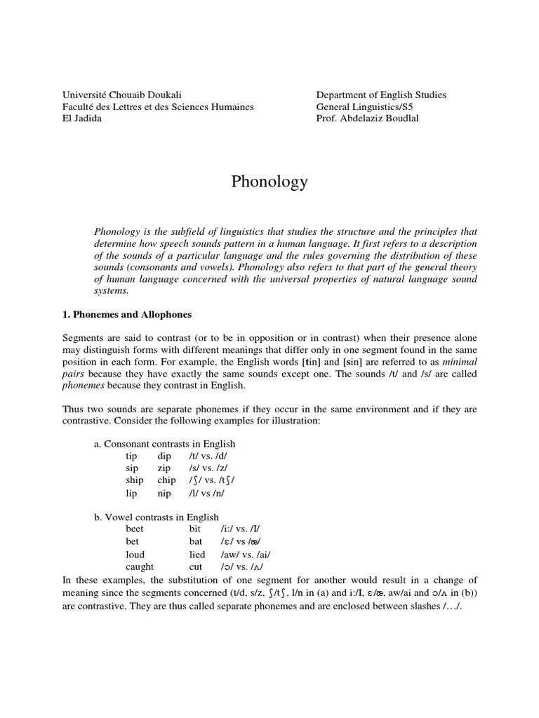 Phonology is the subfield of linguistics that studies the structure and the principles that determine how speech sounds pattern in a human language. It first refers to a description of the sounds of a particular language and the rules governing the distribution of these sounds (consonants and vowels). Phonology also refers to that part of the general theory of human language concerned with the universal properties of natural language sound systems. 1. Phonemes and Allophones Segments are said to contrast (or to be in opposition or in contrast) when their presence alone may distinguish forms with different meanings that differ only in one segment found in the same position in each form. For example, the English words [tin] and [sin] are referred to as minimal pairs because they have exactly the same sounds except one. The sounds /t/ and /s/ are called phonemes because they contrast in English. Thus two sounds are separate phonemes if they occur in the same environment and if they are contrastive. Consider the following examples for illustration: a. Consonant contrasts in English tip dip /t/ vs. /d/ sip zip /s/ vs. /z/ ship chip // vs. /t/ lip nip /l/ vs /n/ b. Vowel contrasts in English beet bit /i:/ vs. /I/ bet bat // vs // loud lied /aw/ vs. /ai/ caught cut // vs. // In these examples, the substitution of one segment for another would result in a change of meaning since the segments concerned (t/d, s/z, /t, l/n in (a) and i:/I, /, aw/ai and / in (b)) are contrastive. They are thus called separate phonemes and are enclosed between slashes //.