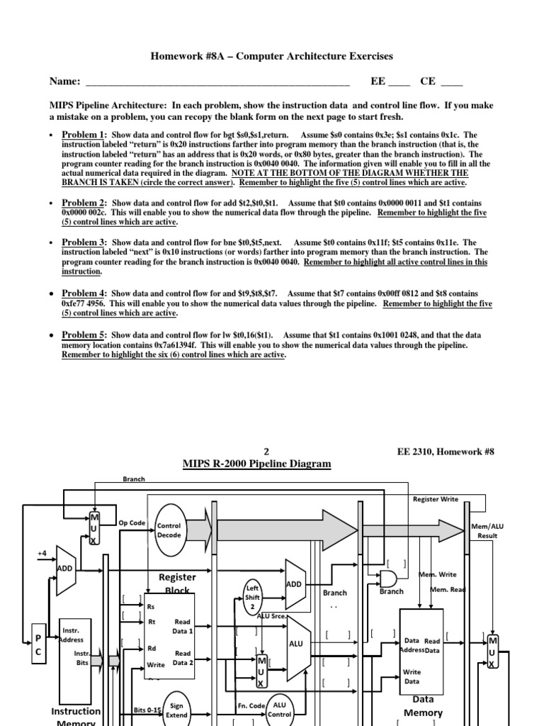 Assume that $t7 contains 0x00ff 0812 and $t8 contains 0xfe77 4956. This will enable you to show the numerical data values through the pipeline. Remember to highlight the five (5) control lines which are active. Assume that $t1 contains 0x1001 0248, and that the data memory location contains 0x7a61394f. This will enable you to show the numerical data values through the pipeline. Remember to highlight the six (6) control lines which are active.