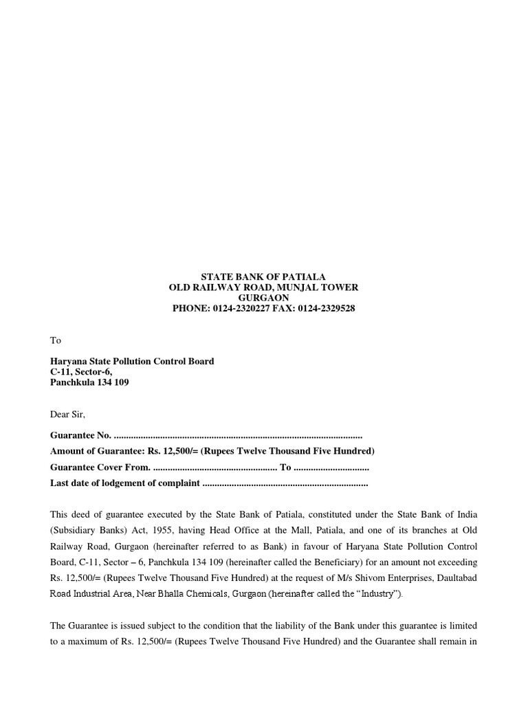 This deed of guarantee executed by the State Bank of Patiala, constituted under the State Bank of India (Subsidiary Banks) Act, 1955, having Head Office at the Mall, Patiala, and one of its branches at Old Railway Road, Gurgaon (hereinafter referred to as Bank) in favour of Haryana State Pollution Control Board, C-11, Sector 6, Panchkula 134 109 (hereinafter called the Beneficiary) for an amount not exceeding Rs. 12,500/= (Rupees Twelve Thousand Five Hundred) at the request of M/s Shivom Enterprises, Daultabad Road Industrial Area, Near Bhalla Chemicals, Gurgaon (hereinafter called the Industry).