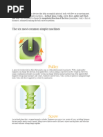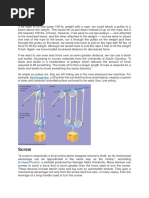 A screw is one of the most commonly used mechanical devices in the world. It is machine that converts rotational motion into linear motion. A screw has a long and thin metal shaft with threads spiraling along its length. It also had a turning head with a groove where a screwdriver can be used to rotate the screw. The strength of a screws hold depends on the width of the threads and the distance between them. The closer and wider the threads, the stronger the hold will be. However, more threads require more rotations to attach the screw and wider threads require more force in the rotations. The mechanical advantage if the screw increases when the angle of the spiral increases. The screw has become an integral part of the mechanical age. It can be used to: nut and bolt Hold things together. Car juck Lift heavy loads. Drill gun Drill holes on objects. Sometimes, its not easy to lift objects with only human force. This problem can be fixed with a help of a simple machine like pulley. What is a Pulley? A basic pulley comprises of a wheel on fixed axle, with a groove along the edges to guide a rope or cable. Where, Load = the weight of an object Effort = the amount of force required to life or move this object. When you put two or more wheels together, and run a rope around them, you have created a great lifting machine. As you add more pulleys, you increase your mechanical advantage and it becomes very easy to life the same load.