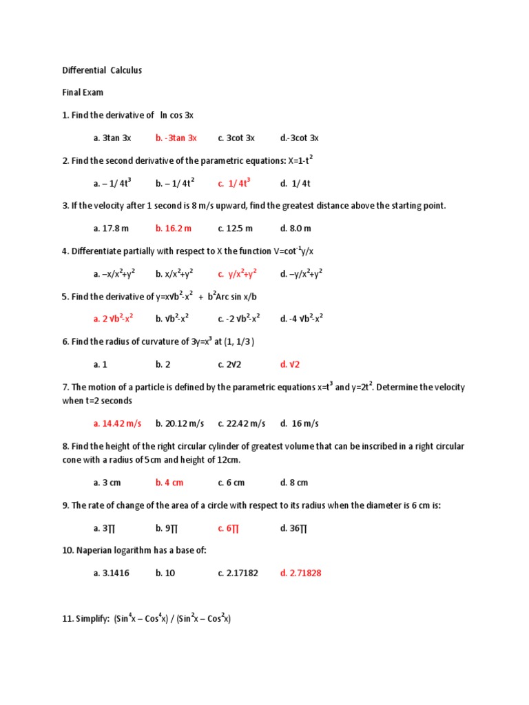 Differential Calculus Final Exam 1. Find the derivative of ln cos 3x a. 3tan 3x b. -3tan 3x c. 3cot 3x d.