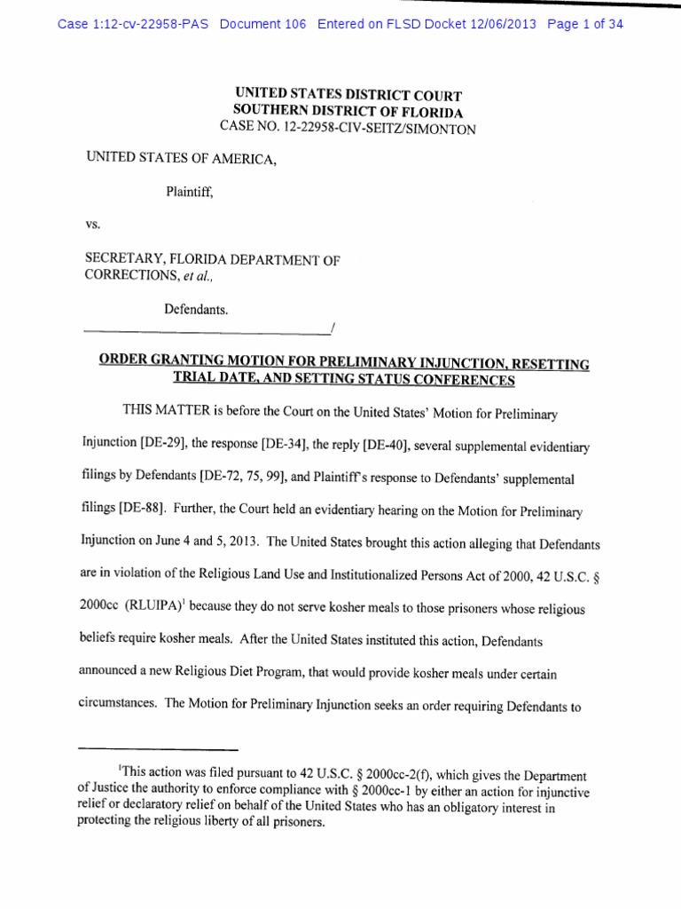 of f er e dt o wor k wi t h FDOC t o ne got i a t e ar e s ol ut i on t hatma deakos he rdi e tava i l a bl et oa l l Fl or i dapr i s one r swi t hs i nc er er e l i gi ousg r o undsf orke e pi ng kos he r . U. S.Ex.1 9.De f e nda nt s r e f us ed t oc ons i de ra ny c ha nget ot he i rpol i ci e si nr es pons et ot hef i ndi ngsoft he Uni t ed St at e s' i nves t i ga t i on,a nd on Aug us tl 4, 201 2,t he Uni t e d St a t e sf i l e dt hei ns t a nts ui t . Com pl ai nt , D EI.