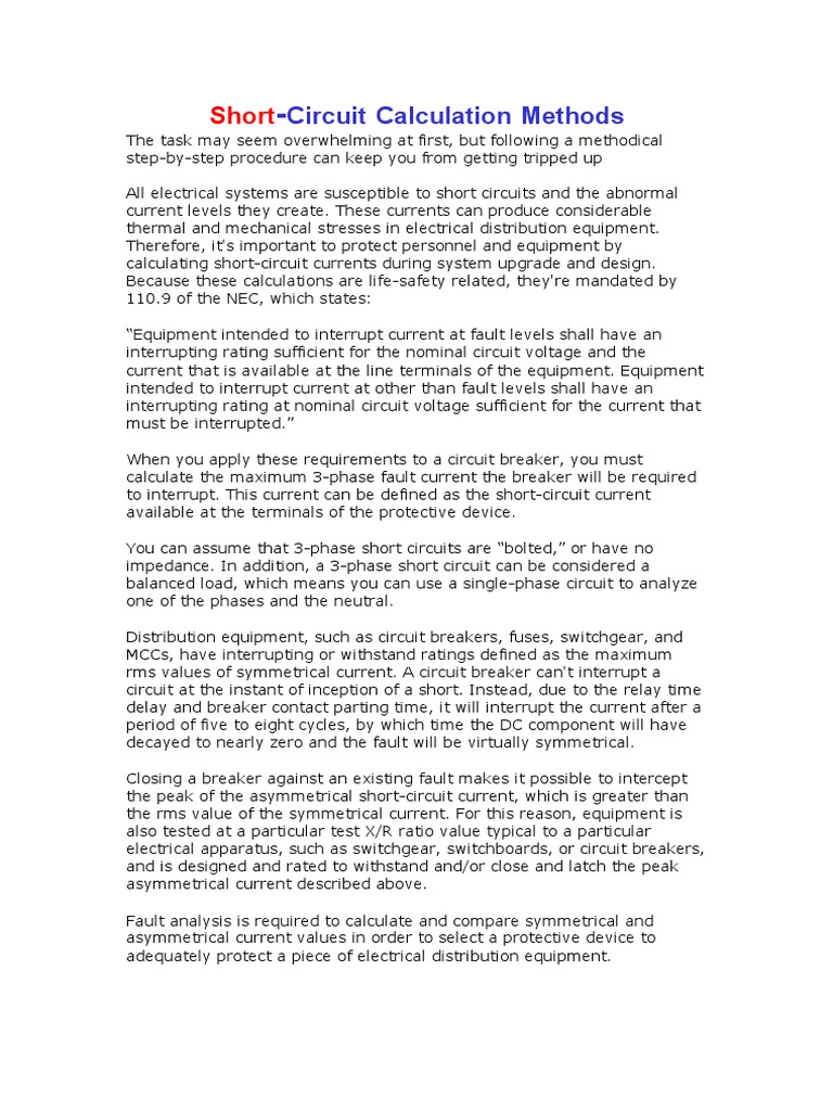 getting tripped up All electrical systems are susceptible to short circuits and the abnormal current levels they create. These currents can produce considerable thermal and mechanical stresses in electrical distribution equipment. Therefore, it's important to protect personnel and equipment by calculating short-circuit currents during system upgrade and design. Because these calculations are life-safety related, they're mandated by !." of the #$%, which states& '$quipment intended to interrupt current at fault levels shall have an interrupting rating sufficient for the nominal circuit voltage and the current that is available at the line terminals of the equipment. $quipment intended to interrupt current at other than fault levels shall have an interrupting rating at nominal circuit voltage sufficient for the current that must be interrupted.( )hen you apply these requirements to a circuit breaker, you must calculate the ma*imum +-phase fault current the breaker will be required to interrupt. This current can be defined as the short-circuit current available at the terminals of the protective device. ,ou can assume that +-phase short circuits are 'bolted,( or have no impedance. -n addition, a +-phase short circuit can be considered a balanced load, which means you can use a single-phase circuit to analy.e one of the phases and the neutral. /istribution equipment, such as circuit breakers, fuses, switchgear, and 0%%s, have interrupting or withstand ratings defined as the ma*imum rms values of symmetrical current. A circuit breaker can't interrupt a circuit at the instant of inception of a short. -nstead, due to the relay time delay and breaker contact parting time, it will interrupt the current after a period of five to eight cycles, by which time the /% component will have decayed to nearly .ero and the fault will be virtually symmetrical. %losing a breaker against an e*isting fault makes it possible to intercept the peak of the asymmetrical short-circuit current, which is greater than the rms value of the symmetrical current. 1or this reason, equipment is also tested at a particular test 234 ratio value typical to a particular electrical apparatus, such as switchgear, switchboards, or circuit breakers, and is designed and rated to withstand and3or close and latch the peak asymmetrical current described above. 1ault analysis is required to calculate and compare symmetrical and asymmetrical current values in order to select a protective device to adequately protect a piece of electrical distribution equipment.
