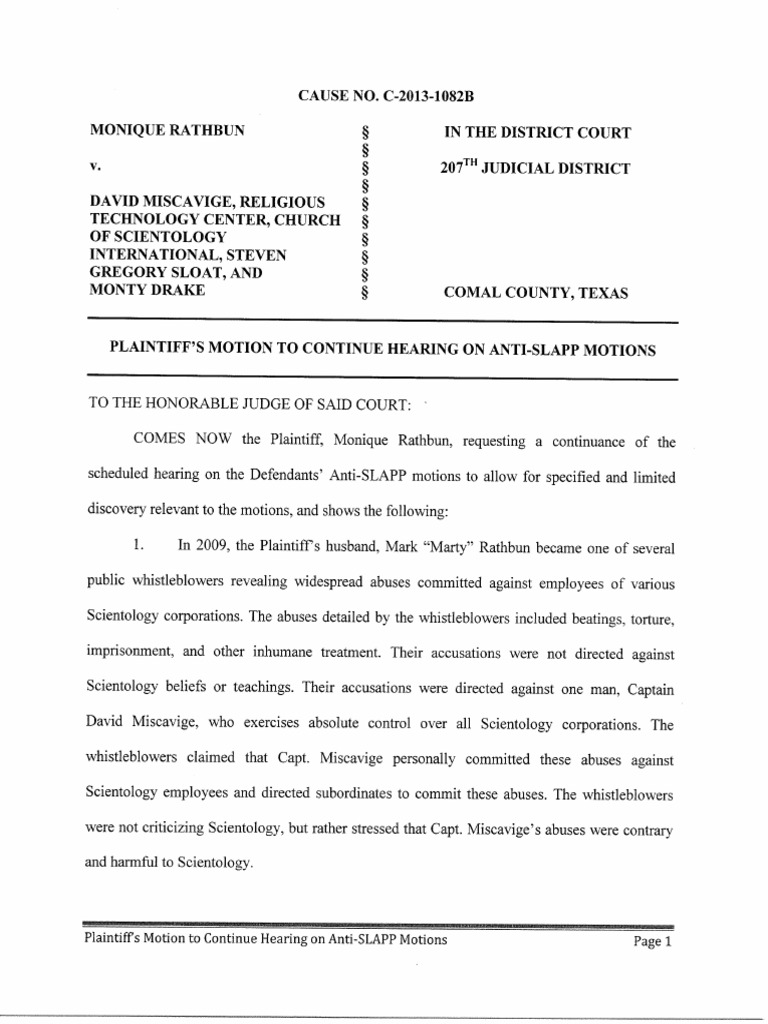 Monique Rathbun vs. Scientology: Plaintiff Motion Continuance For Continuance On anti-SLAPP Matter