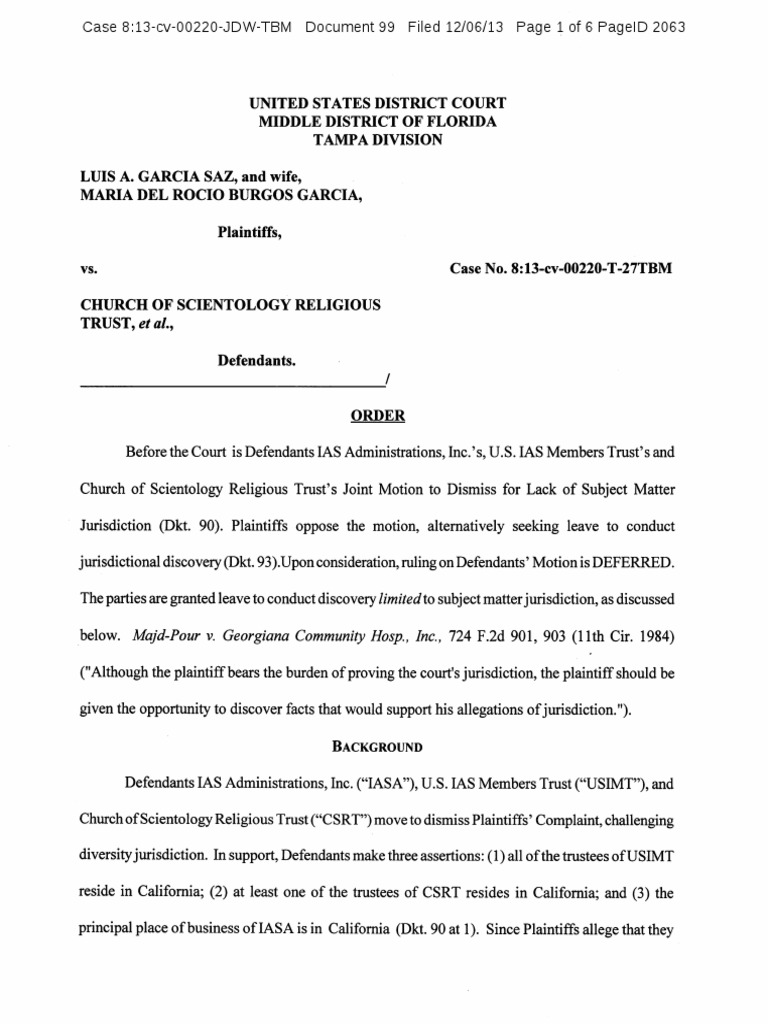 Garcia v. Scientology: Order Regarding Diversity Discovery