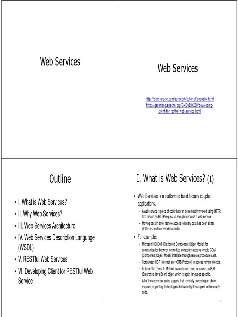 I. What is Web Services? II. Why Web Services? III. Web Services Architecture IV. Web Services Description Language (WSDL) V. RESTful Web Services VI. Developing Client for RESTful Web Service