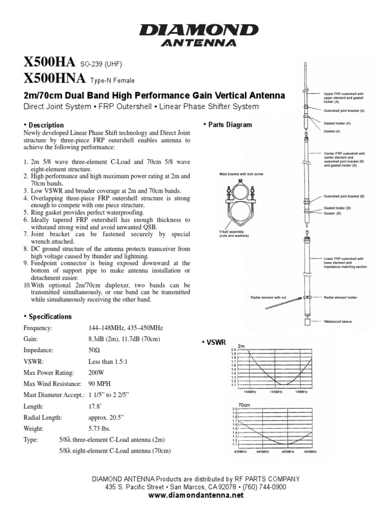 DIAMOND ANTENNA Products are distributed by RF PARTS COMPANY 435 S. Pacific Street San Marcos, CA 92078 (760) 744-0900