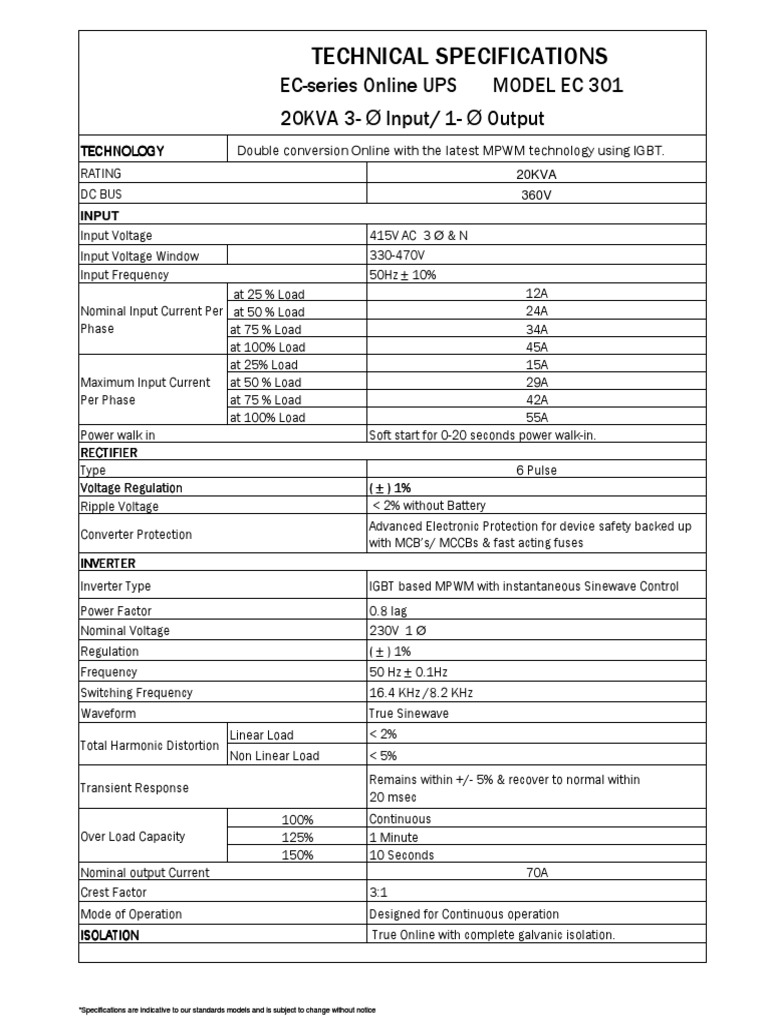 20KVA EC-Series Online UPS Specifications