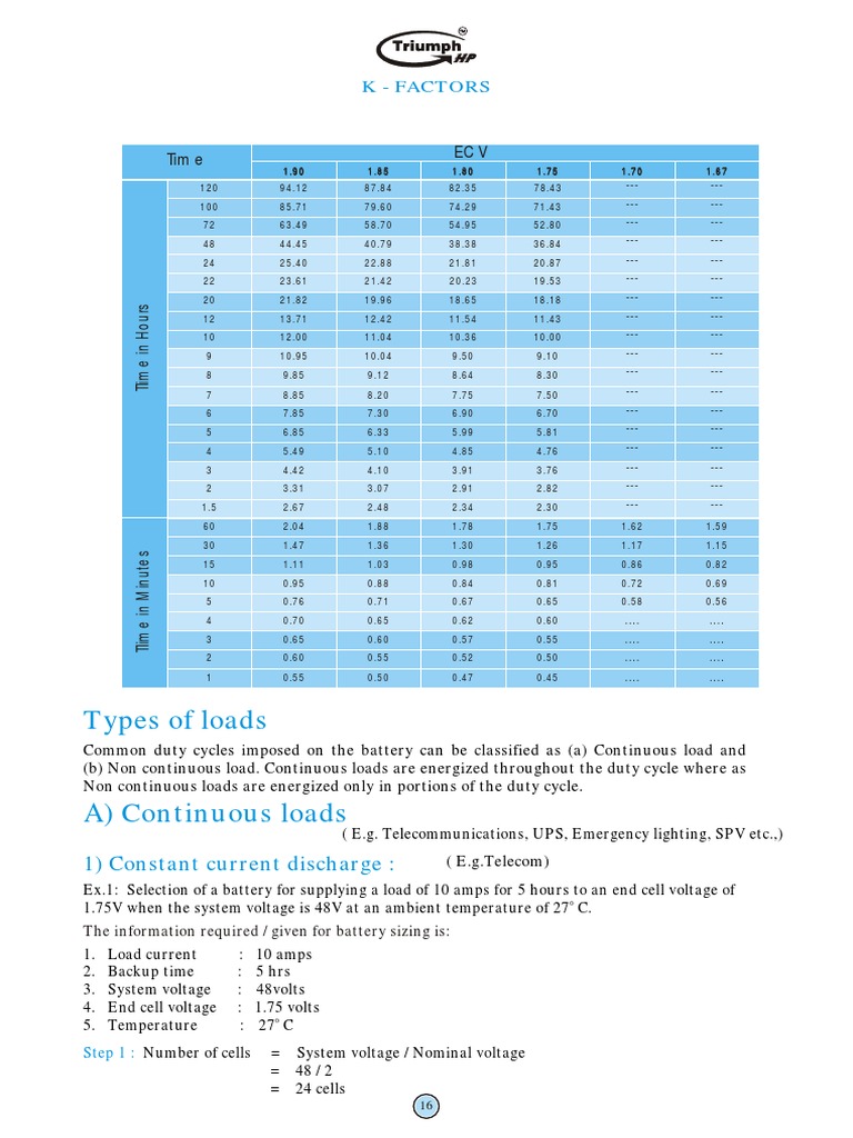 Ex.1: Selection of a battery for supplying a load of 10 amps for 5 hours to an end cell voltage of