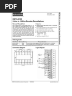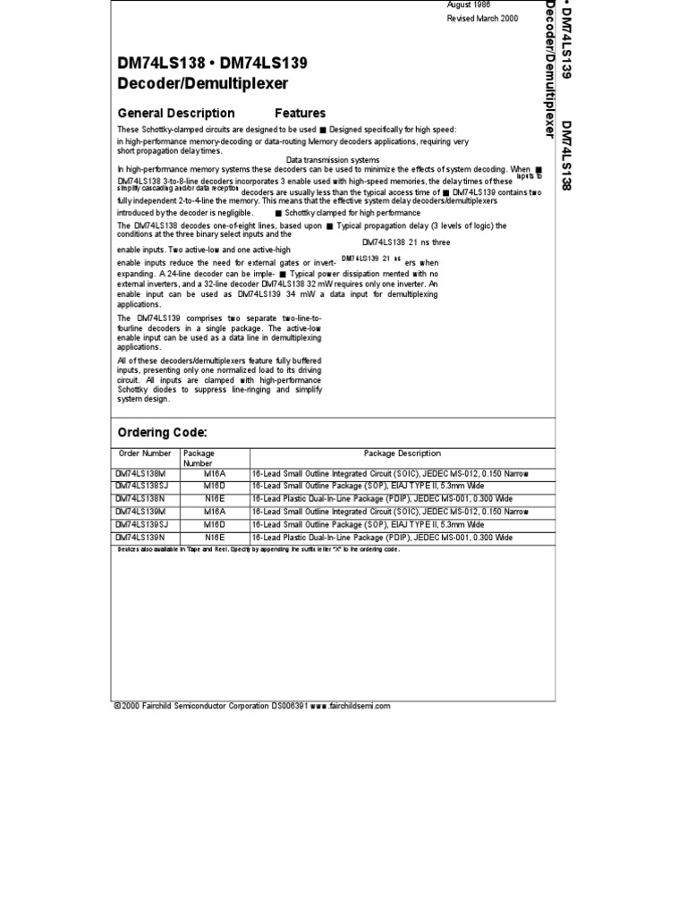%hese Schott&'(clamped circuits are desi ned to )e used Desi ned specificall' for hi h speed* in hi h(performance memor'(decodin or data(routin $emor' decoders applications+ re,uirin #er' short propa ation dela' times. Data transmission s'stems -n hi h(performance memor' s'stems these decoders can )e used to minimi.e the effects of s'stem decodin . /hen inputs to D$012S13! 3(to(!(line decoders incorporates 3 ena)le used with hi h(speed memories+ the dela' times of these simplif' cascadin and3or data reception decoders are usuall' less than the t'pical access time of D$012S139 contains two full' independent 2(to(1(line the memor'. %his means that the effecti#e s'stem dela' decoders3demultiple4ers introduced )' the decoder is ne li i)le. Schott&' clamped for hi h performance %he D$012S13! decodes one(of(ei ht lines+ )ased upon %'pical propa ation dela' 53 le#els of lo ic6 the conditions at the three )inar' select inputs and the D$012S13! 21 ns three ena)le inputs. %wo acti#e(low and one acti#e(hi h ena)le inputs reduce the need for e4ternal ates or in#ert( ers when e4pandin . A 21(line decoder can )e imple( %'pical power dissipation mented with no e4ternal in#erters+ and a 32(line decoder D$012S13! 32 m/ re,uires onl' one in#erter. An ena)le input can )e used as D$012S139 31 m/ a data input for demultiple4in applications. %he D$012S139 comprises two separate two(line(to( fourline decoders in a sin le pac&a e. %he acti#e(low ena)le input can )e used as a data line in demultiple4in applications. All of these decoders3demultiple4ers feature full' )uffered inputs+ presentin onl' one [Link] load to its dri#in circuit. All inputs are clamped with hi h(performance Schott&' diodes to suppress line(rin in and simplif' s'stem desi n.