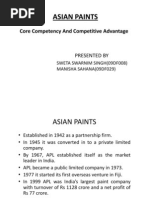 Strong finanacial helps the company to invest in marketing and brandrecall activities. vii. Comprehensive nationwide coverage of market. b) Weakness i. Seasonal demand, hence in offseason can lead to cash flow problems. ii. Innovation in developing new product is inadequate. iii. Weakness on the technology front in industrial paints. c) CORE COMPETENCE Brand image is the main core competency for the Asian paint i.e. well established brand name over the years provides it competitive benefit for its product. d) COMPETITIVE ADVANTAGE Lack of any threatening competition Nearest competitor half our size Balanced portfolio of products Products are positioned across All price points (economy Mid range - premium) Closeness to customers & keen market Understanding Completely redefined the Exterior Coatings market Products perceived as positive value propositions by Customers