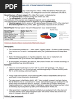b. post-liberalization period i. foreign direct investment ii. reduction on import duty So with liberalization price discrimination of government, import duty and high excise got reduced after liberalization. 4) Technological factors i. Innovation a. Industry gets continuously affected by the innovations in technology as they need to adopt latest one so as to compete in the market. Some innovations can be: Water based paints which are developed taking into account the environment and health of persons. Any one company coming up with innovation forces others in the industry to come up with new to overcome the innovation or to adopt competitors innovation. ii. Greater emphasis on research and development