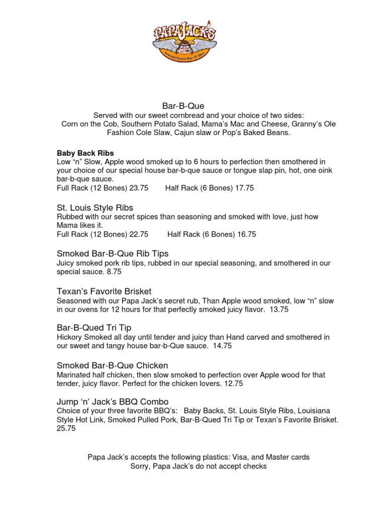 Papa Jack’s accepts the following plastic: Visa, and Master cards