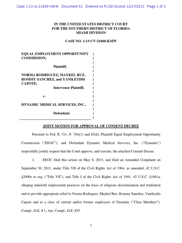IN THE UNITED STATES DISTRICT COURT FOR THE SOUTHERN DISTRICT OF FLORIDA MIAMI DIVISION CASE NO. 1:13-CV-21666-KMW EQUAL EMPLOYMENT OPPORTUNITY COMMISSION, Plaintiff, NORMA RODRIGUEZ, MAYKEL RUZ, ROMMY SANCHEZ, and YANILEYDIS CAPOTE, Intervenor Plaintiff, v. DYNAMIC MEDICAL SERVICES, INC., Defendant. ) ) ) ) ) ) ) ) ) ) ) ) ) ) ) ) JOINT MOTION FOR APPROVAL OF CONSENT DECREE