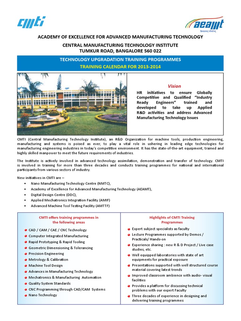 CMTI (Central Manufacturing Technology Institute), an R&D Organization for machine tools, production engineering, manufacturing and systems is poised as ever, to play a vital role in ushering in leading edge technologies for manufacturing engineering industries in todays competitive environment. It has the state-of-the-art equipment, trained and highly skilled manpower to meet the future requirements of industries. The Institute is actively involved in advanced technology assimilation, demonstration and transfer of technology. CMTI is involved in training for more than three decades and conducts training programmes for national and international participants from various sectors of industry. New initiatives in CMTI are Nano Manufacturing Technology Centre (NMTC), Academy of Excellence for Advanced Manufacturing Technology (AEAMT), Digital Design Centre (DDC), Applied Mechatronics Integration Facility (AMIF) Advanced Machine Tool Testing Facility (AMTTF) CMTI offers training programmes in the following areas CAD / CAM / CAE / CNC Technology Computer Integrated Manufacturing Rapid Prototyping & Rapid Tooling Geometric Dimensioning & Tolerancing Precision Engineering Metrology & Calibration Machine Tool Design Advances in Manufacturing Technology Mechatronics & Manufacturing Automation Quality System Standards CNC Programming through CAD/CAM Systems Nano Technology Highlights of CMTI Training Programmes Expert subject specialists as faculty Lecture Programmes supported by Demos / Practicals/ Hands-on Experience sharing : new R & D Project / Live case studies, etc. Well equipped laboratories with state of art equipments for practical exposure Presentations supported with well structured course material covering latest trends Improved classroom ambience with audio- visual facilities Provides a platform for discussing technical problems with our expert Faculty Three decades of experience in designing and delivering training programmes
